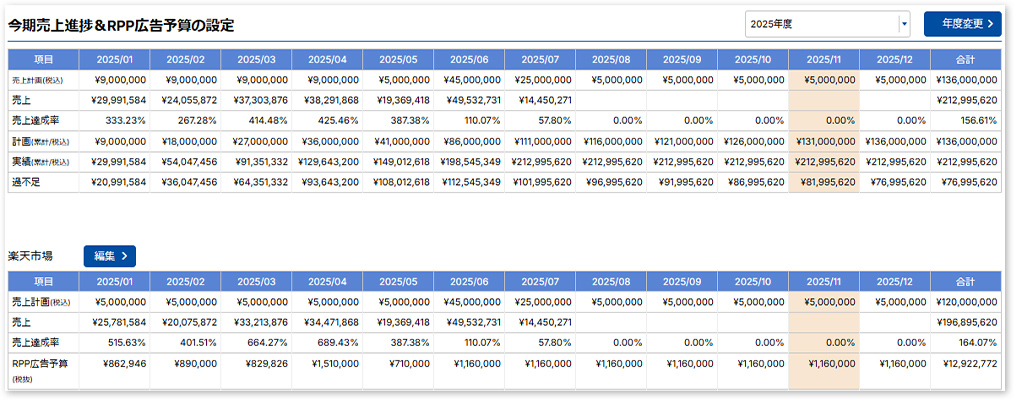 楽天だけでなく他モールも入力でき、EC全体の目標達成状況を把握可能!