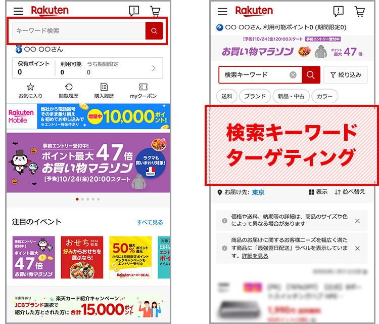 この広告メニューは、楽天市場内で「特定のキーワードを検索しているユーザー」が対象です。つまり、明確なニーズや興味を持っている購買意欲の高いユーザー層にアプローチできるのが大きなメリットです。