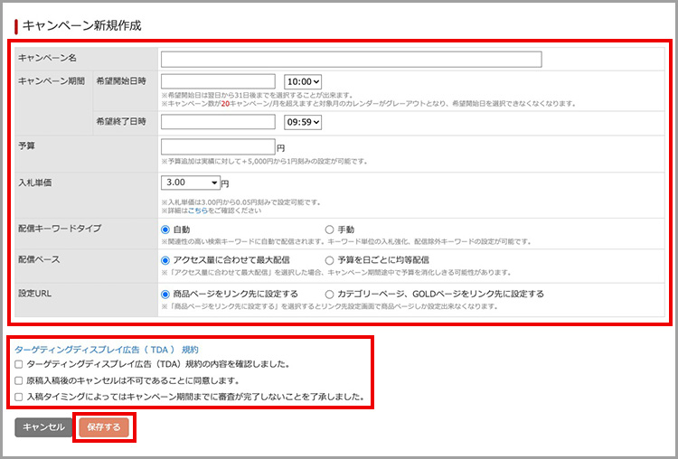 キャンペーン登録後は、バナークリエイティブを入稿し、審査通過後に配信が開始されます。なお、バナー入稿はキャンセル不可・修正不可なので、事前準備が重要です。
